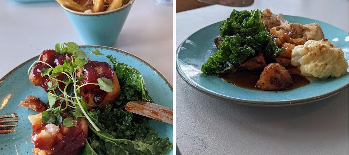 The food and service was absolutely brilliant. Great veggie/vegan and gluten free options - even a Sunday roast if we wanted! Would recommend to anyone. Lovely atmosphere and our dogs were very welcomed - they even were given a sausage each from the staff!